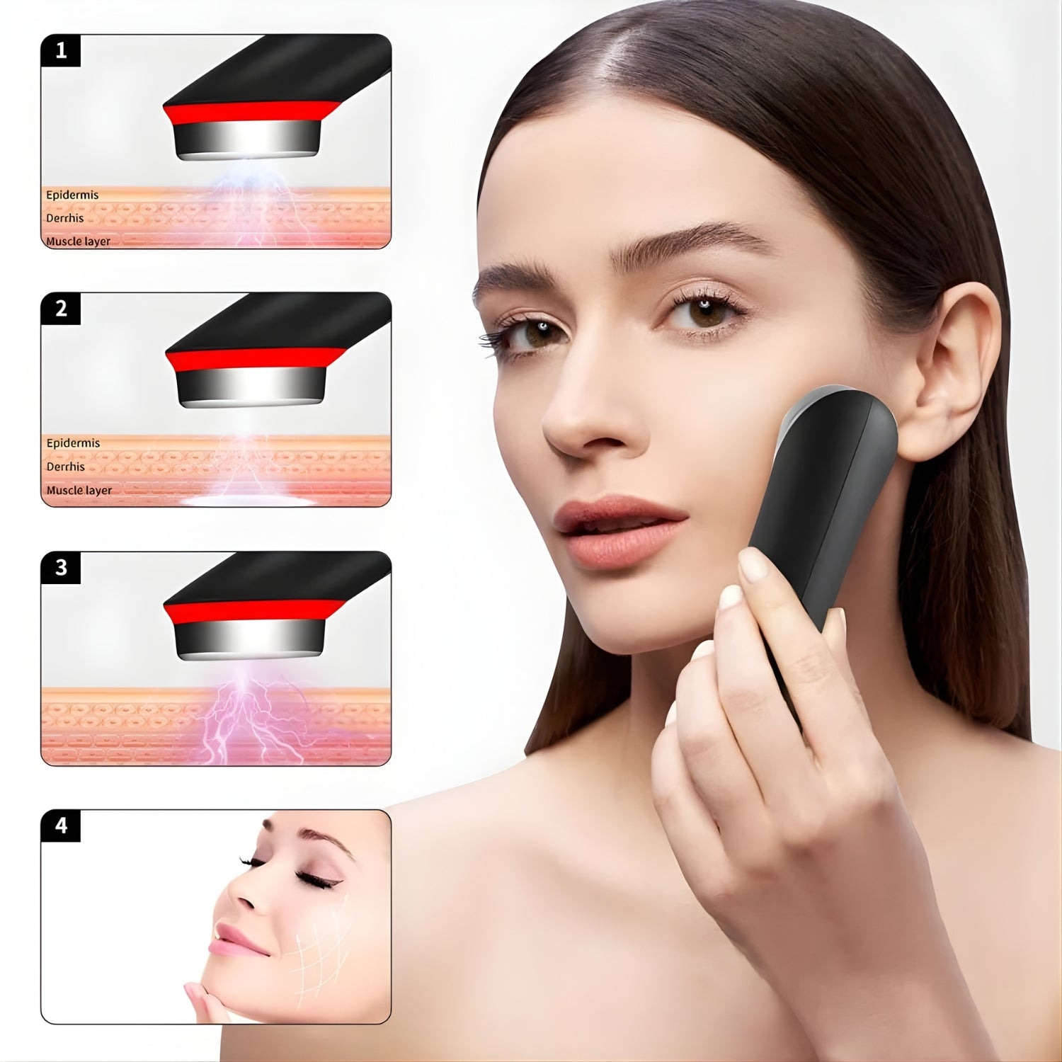 It stimulates collagen and facial muscles using LED light and EMS microcurrent.